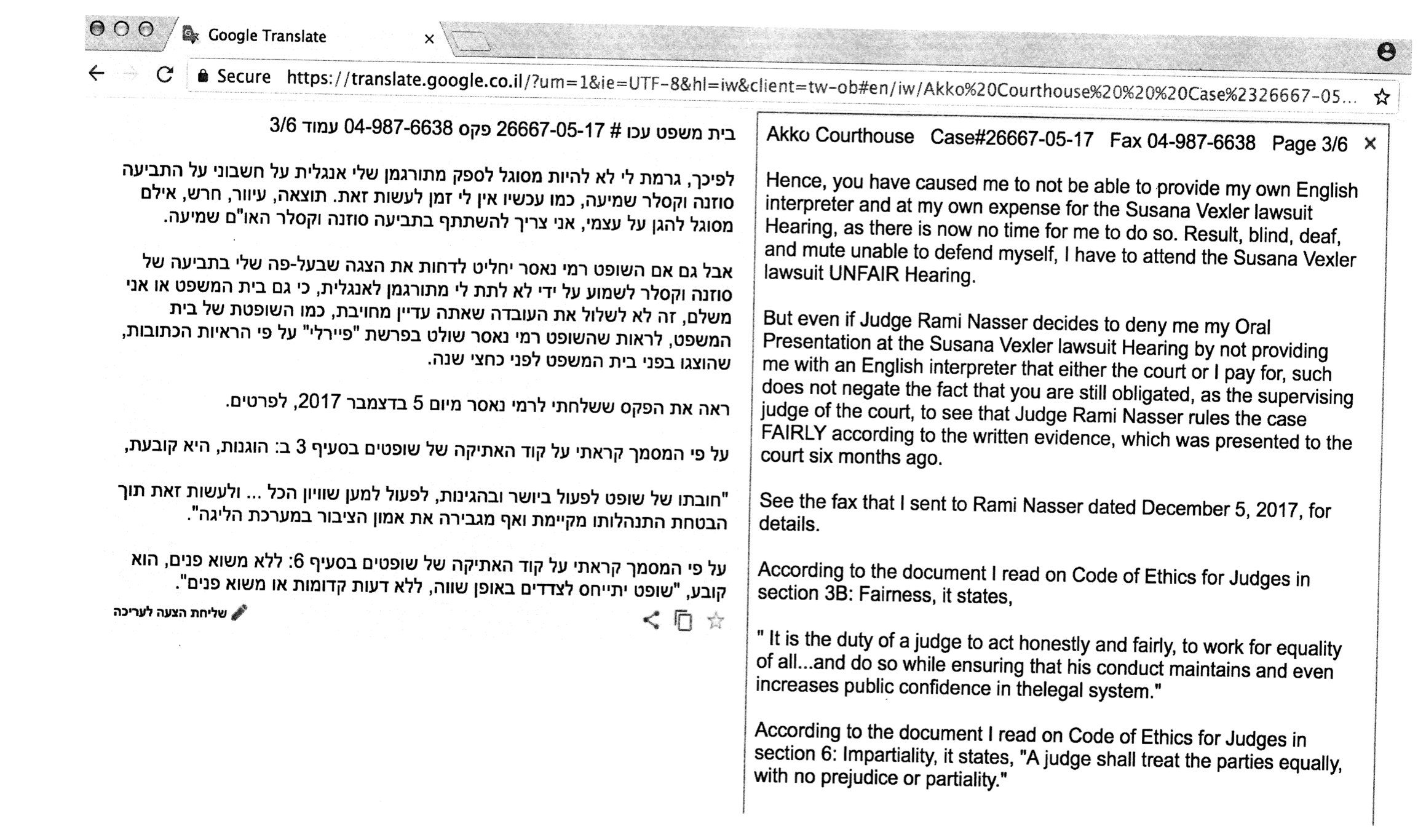 Instead, this was going to be the third Justice and the third Hearing that the Akko Magistrate Court had scheduled over the course of six months for the Susana Vexler Lawsuit in order to deny me my necessity for an ENGLISH INTERPRETER.